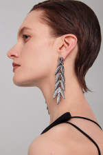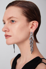 - The product is made of brass plated with black ruthenium, and the earrings are connected in the shape of bamboo leaves. The stone is hand-set without transparent bottom in jewelry craftsmanship. The black color sets off the white stone to highlight the luster of the stone. It has a jewelry temperament and a smart and light design.