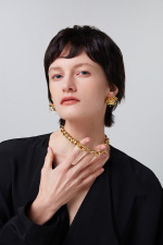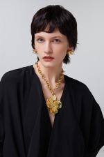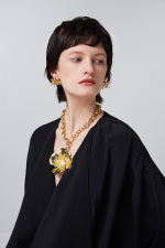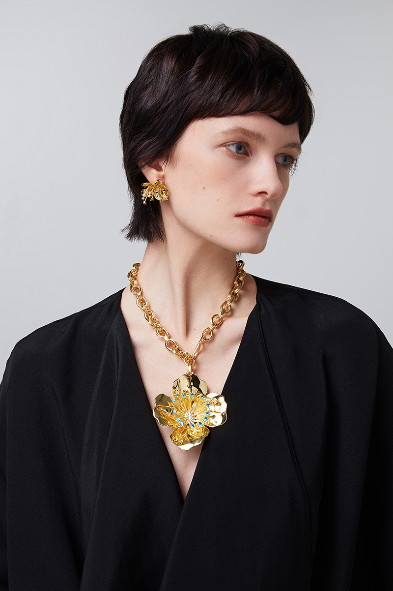 - Necklace with metal glossy polished process, green velvet artemisia flower shape with handmade D chain, exaggerated stamen part of the design, highlighting the beauty of the contrast of the flower, green stamen to break the metal surface of the realistic flower shape, so that the three-dimensional flower visual richer, flowers can be removed, ideal for attending banquets or parties to wear.